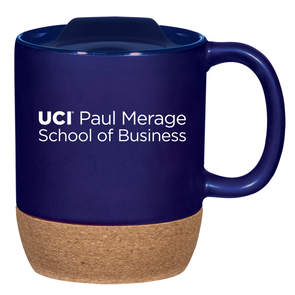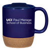 The UCI 14 oz. cork base ceramic mug protects hands and surfaces from the heat.