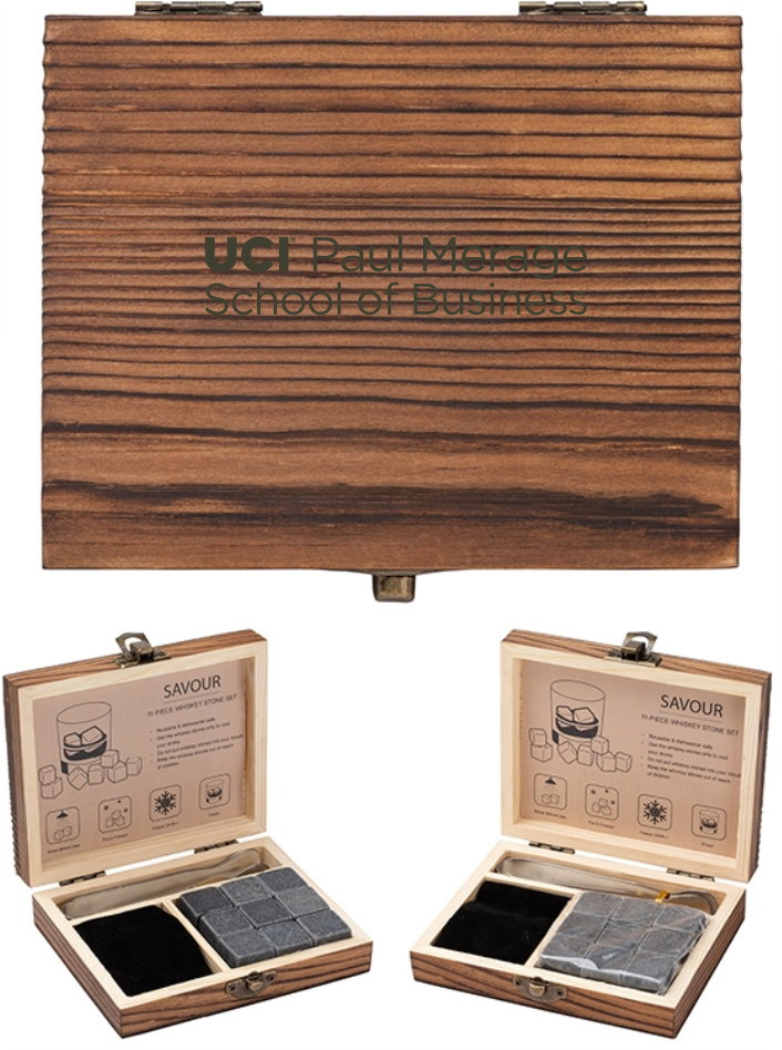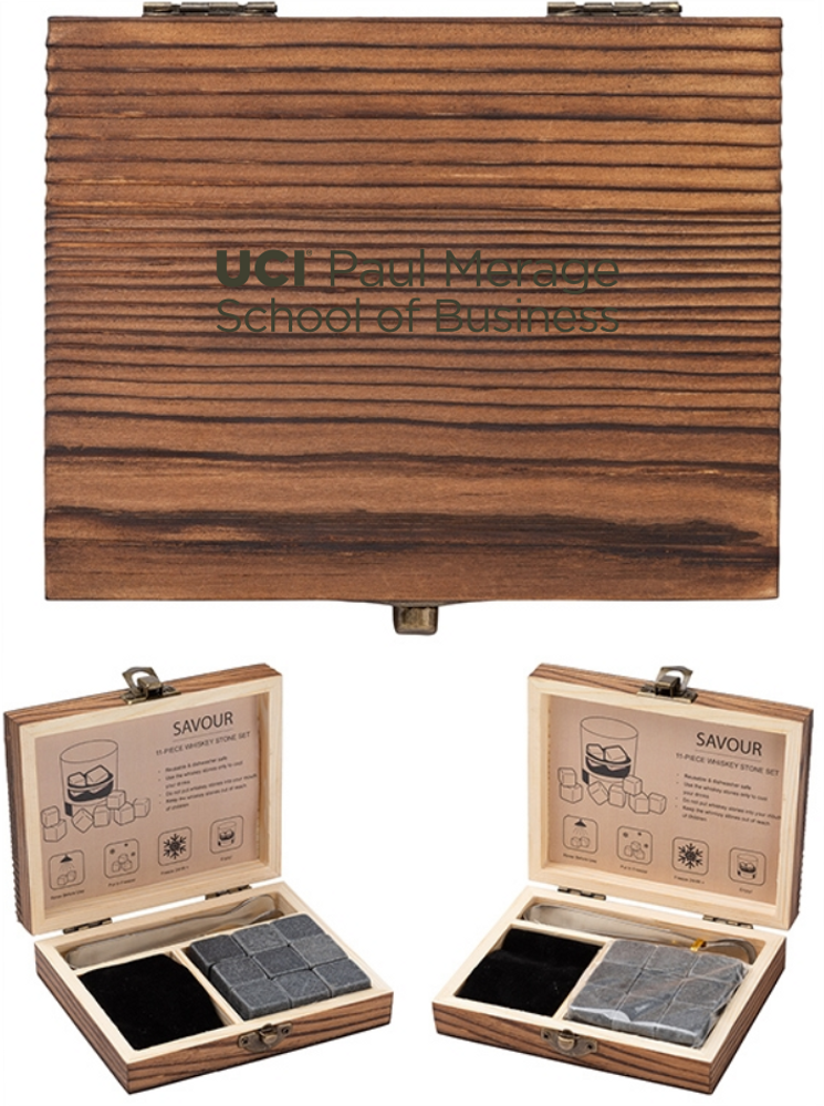 The UCI Whiskey Stone Set comes with 9 freezer-ready basalt stone ice cubes, 1 drawstring bag and 1 pair of tongs and is enclosed in a vintage styled hinged wooden box. Use the ice stones to chill your beverage without watering it down and enjoy the full taste of your preferred drink. Store the stones in the drawstring bag and use the tongs to place them in your drink. Gift this set to your whiskey-loving friends, coworkers and clients.